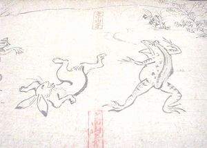 正式な名前は「鳥獣人物戯画」で国宝です。甲巻、乙巻、丙巻、丁巻の4巻からなっていて、甲巻のウサギとカエルが相撲をとっている場面が有名です。